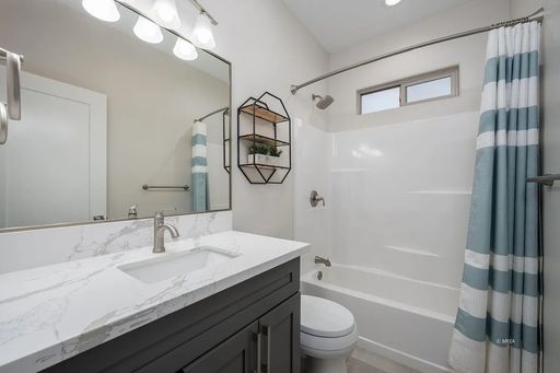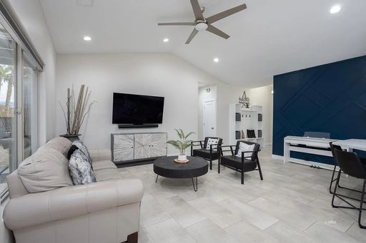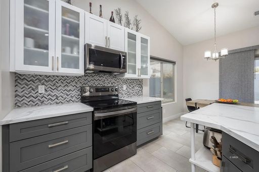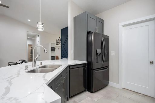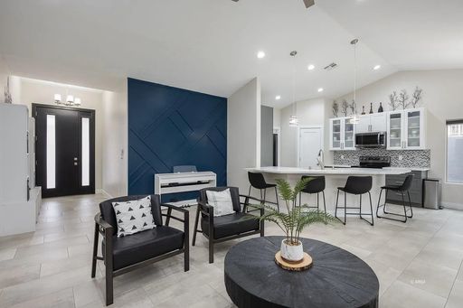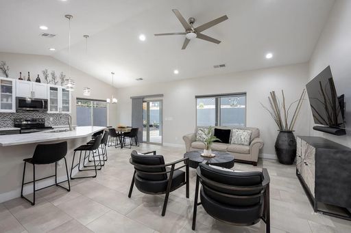Inside, you’ll find a bright open-concept layout with vaulted ceilings and modern finishes throughout. The kitchen features quartz countertops, stainless steel LG appliances, a touchless Kohler faucet, and stylish pendant lighting. The main living areas have beautiful plank tile flooring, with carpet only in the bedrooms.