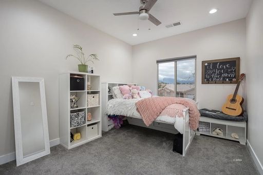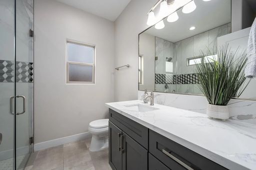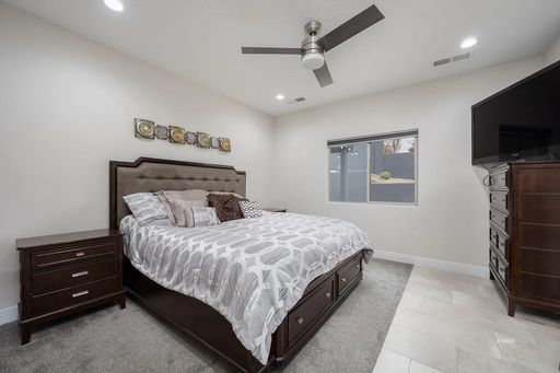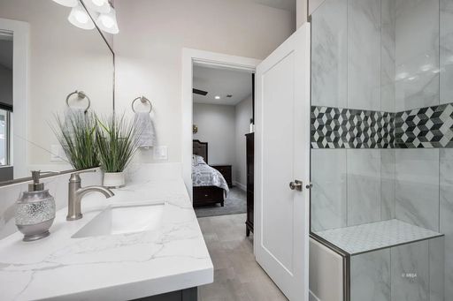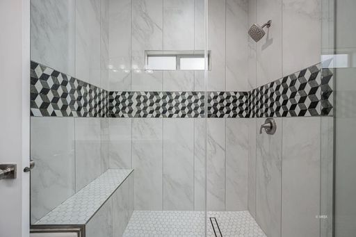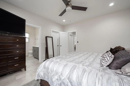 Each bedroom includes a ceiling fan with remote and blackout shades. The bathrooms feature quartz counters, Moen fixtures, and the main bath includes a spacious walk-in tile shower with glass enclosure.