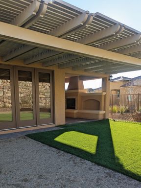Private covered patio with fireplace and entertaining area