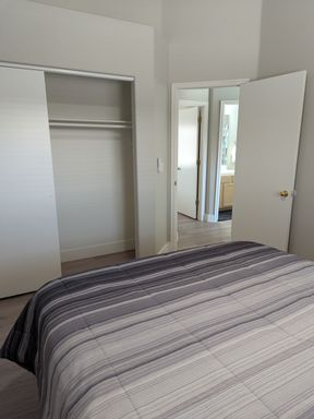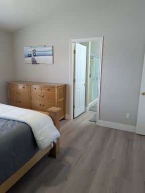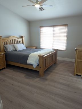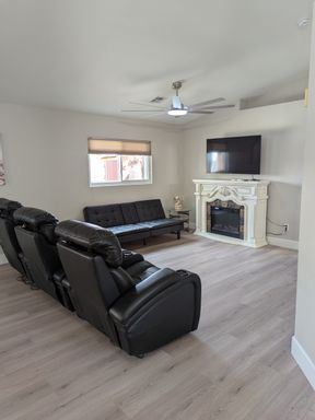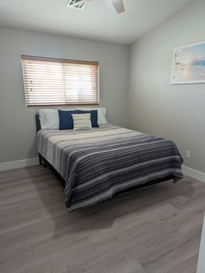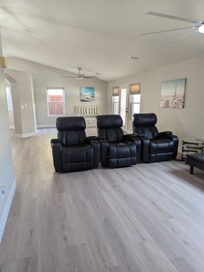 The home comes fully furnished, making it truly move-in ready. The bright living area features large windows that bring in natural light and provide easy access to the backyard.