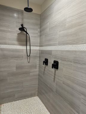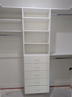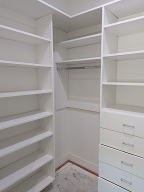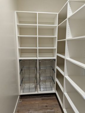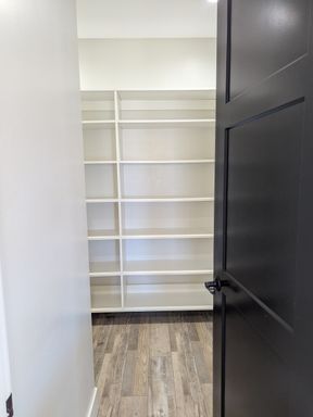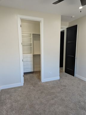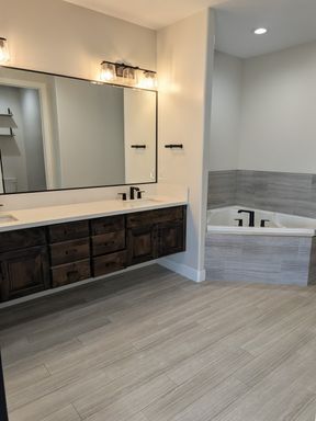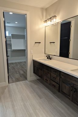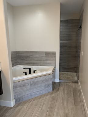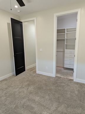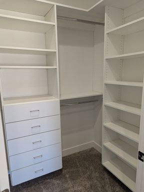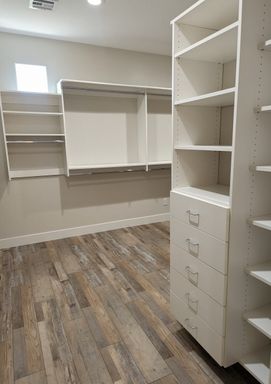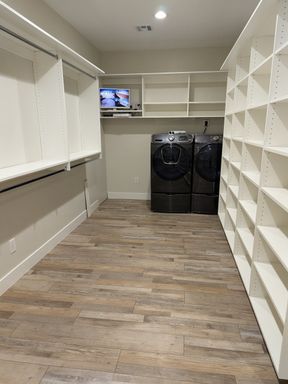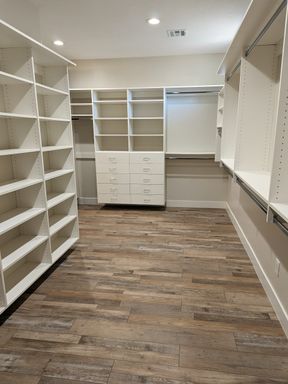 The primary suite is spacious and offers a large master bedroom and bathroom featuring both a walk-in shower and a garden tub, along with a large walk-in closet with built-in shelving and drawers.