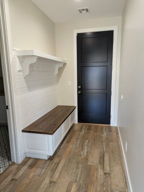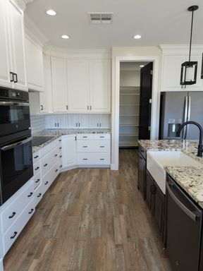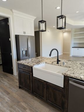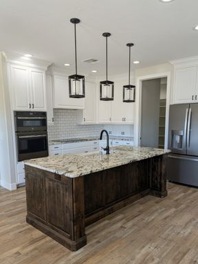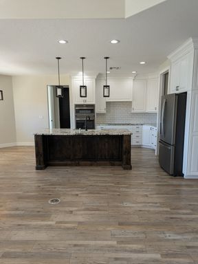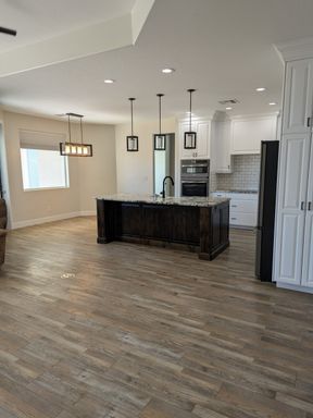 The home features an open and modern layout with LVP flooring throughout the main living areas and carpet in the bedrooms. The kitchen is designed for both style and function and includes stainless steel appliances, a large pantry, upgraded lighting, and a beautiful oversized island with granite countertops, perfect for entertaining or everyday living.