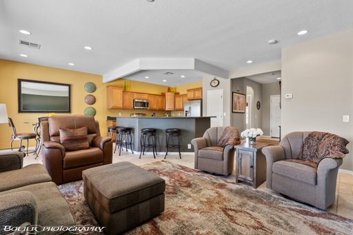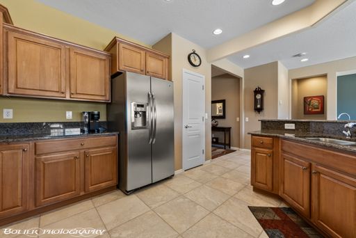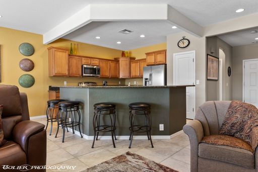 From the moment you step inside, you’re greeted by warm upscale finishes, and an inviting open layout designed for both relaxation and stylish entertaining. The gourmet kitchen showcases rich wood cabinetry, granite countertops, stainless steel appliances, and a spacious breakfast bar. The adjacent dining and living spaces feature elegant furnishings, abundant natural light, and views that frame the serene desert landscape.
