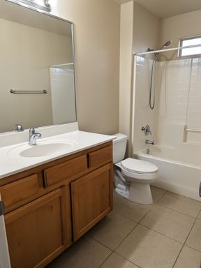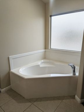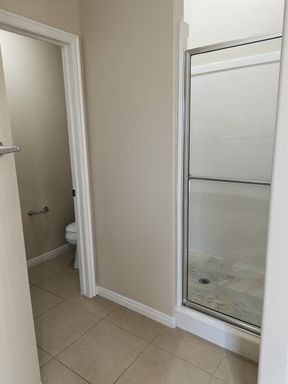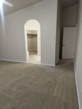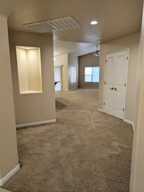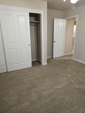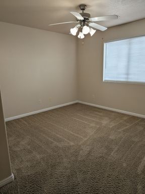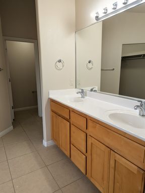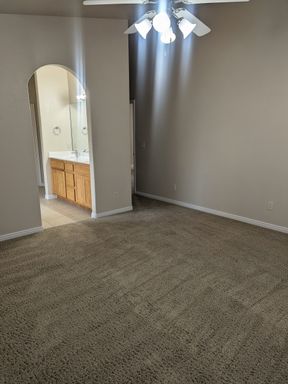 The home’s split-bedroom layout provides privacy and convenience, with two guest bedrooms on one side and a spacious primary suite on the other. The primary bathroom includes a double vanity, adding to the home’s thoughtful design.