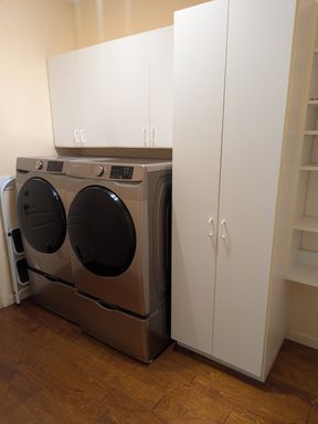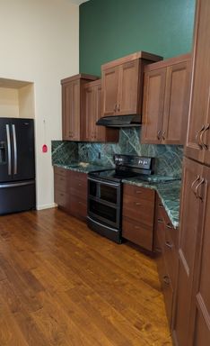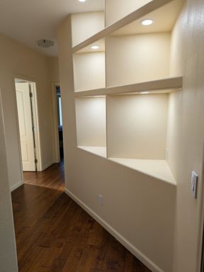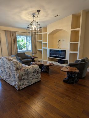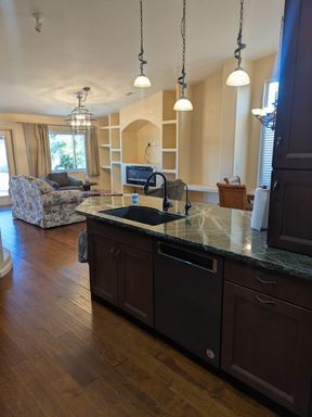 The kitchen is well-appointed with upgraded cabinetry, stone countertops, and ample storage, opening seamlessly to the living and dining areas—perfect for everyday living and entertaining. The living room showcases built-in shelving and a modern fireplace, creating a warm and stylish focal point.