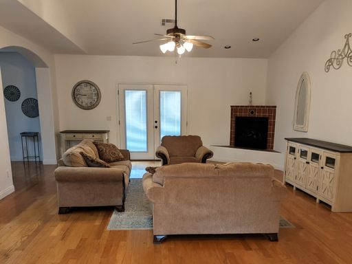 Beautiful custom single-story home featuring 3 bedrooms and 3 bathrooms, situated on a desirable corner lot in a sought-after Mesquite community surrounded by golf course and lake views. This home offers high ceilings, hardwood flooring, and an open, light-filled layout.